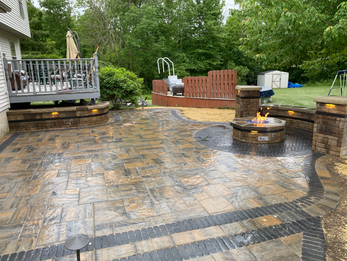 This Project in Streetsboro, Ohio was completed in 2022. This 400 square foot custom patio and walkway were installed after removing and existing sinking concrete patio. We completed this patio with a a custom gas fire pit, Seating walls, and a natural stone bed edge. To really take full advantage of this outdoor living space, we added multiple types of night lighting to enhance this space at night. This Patio Features Oberfield Ozark with a Jamestown accent and border. The walls feature Belgard Tandem Wall with a charcoal accent band.